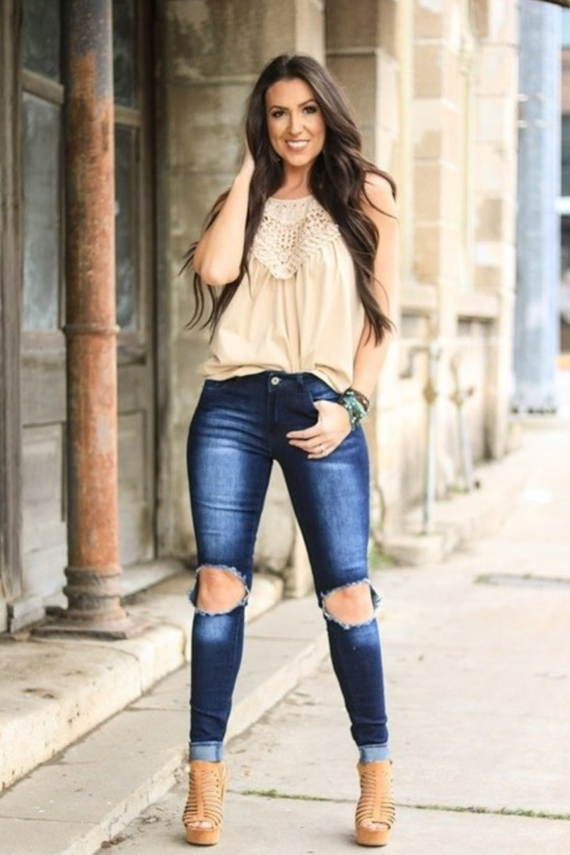 Distressed at knee, skinny pant style.