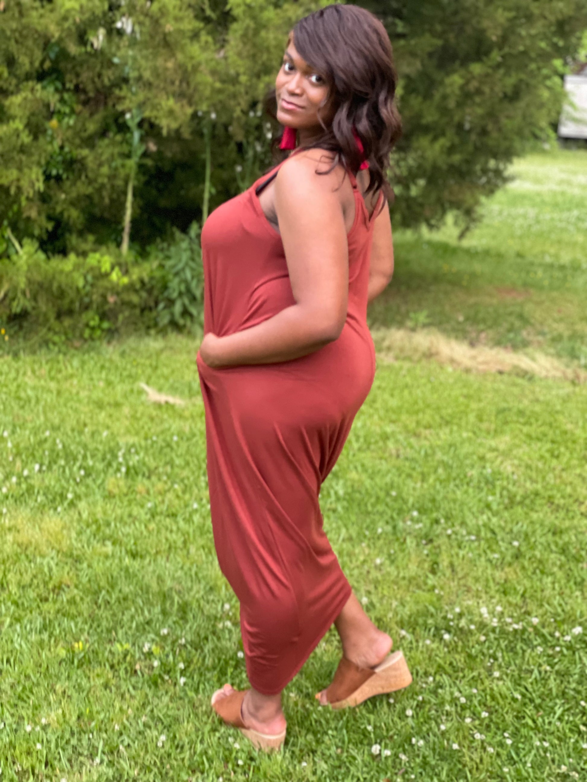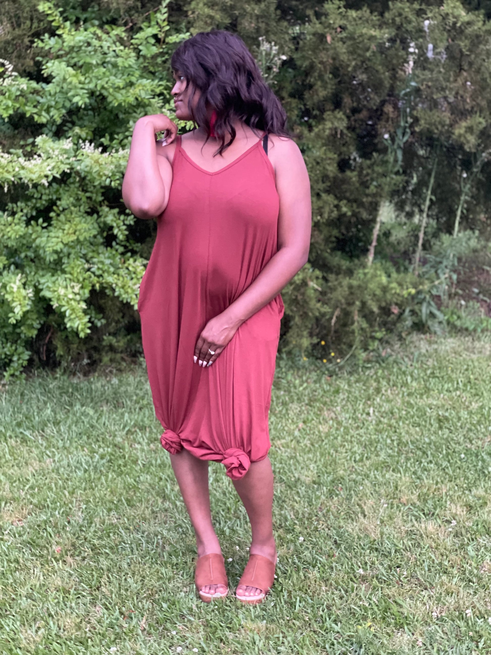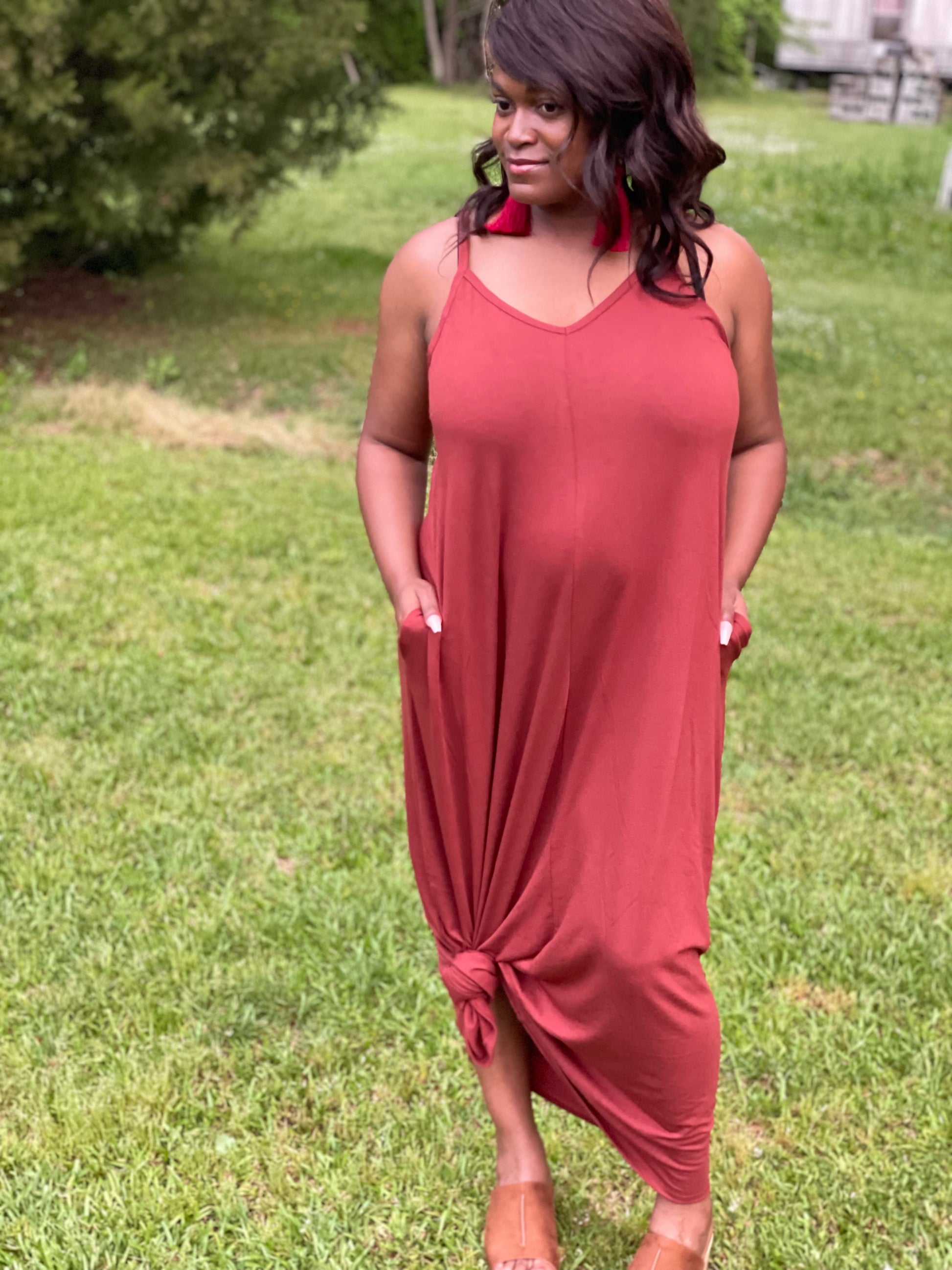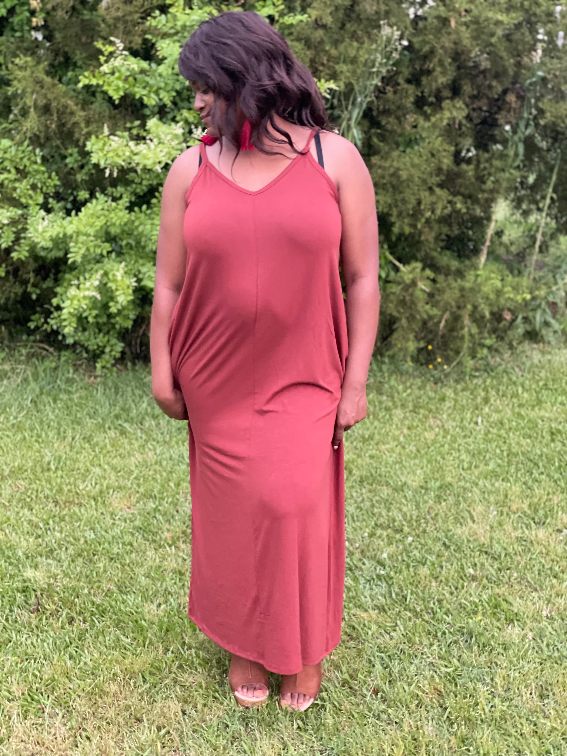 Long spaghetti strap maxi dress with pockets. Runs big. Can go a size down.
